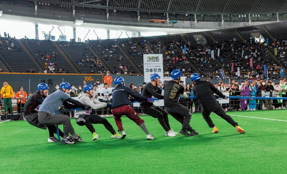 北海道厚真町で毎年開催されている、あつま国際雪上3本引き大会。3本引きは2つのチームが雪上の3本の綱を同時に引き合う、体力・チームワーク・作戦が勝負を決めるユニークな競技です。ほっかいどう大運動会では、プレミストドーム内の特別ルールで実施します。経験者はもちろん未経験者のチームからも幅広く楽しめます。