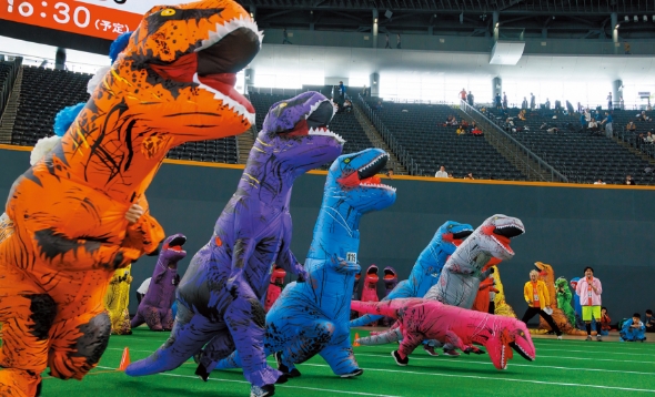 ティラノサウルスの着ぐるみを着て競走する、アメリカ発祥の競技です。日本でもSNSなどで話題になって注目され、各地の地域イベントなどで開催されています。競走中の様子がコミカルで面白く、参加者・観覧者ともに楽しめることが特徴です。
