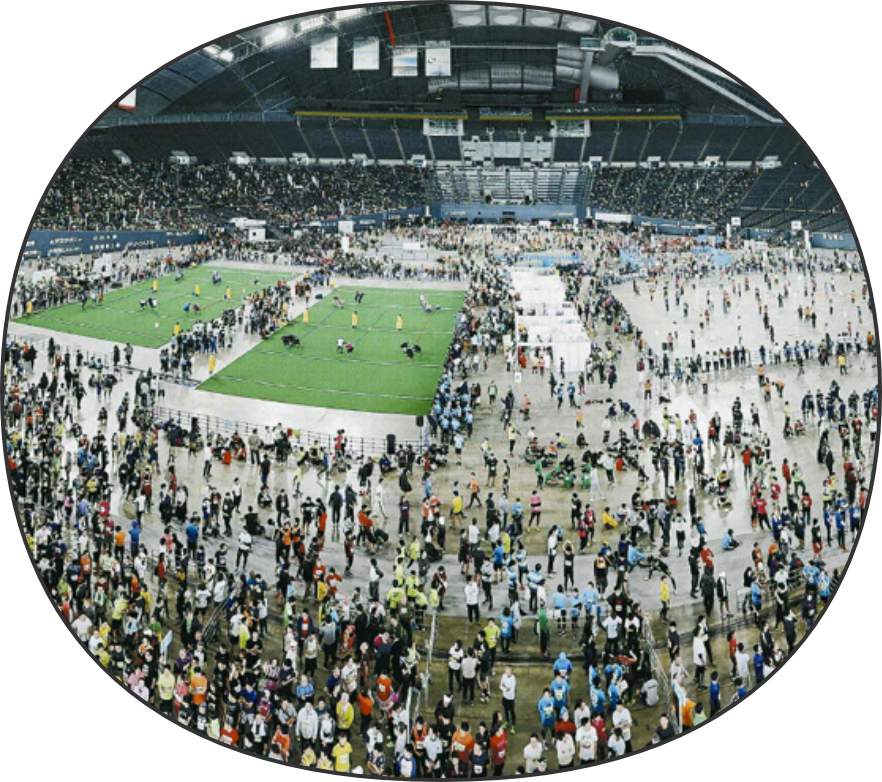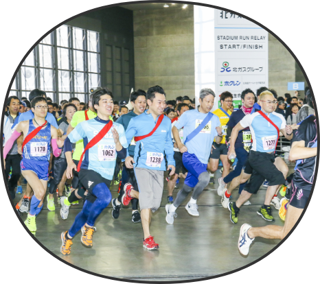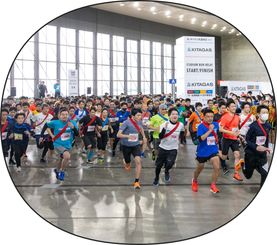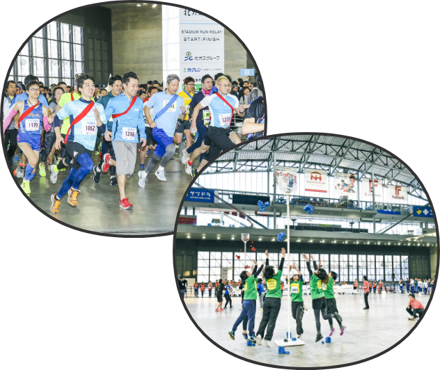 記念すべき第1回目は、札幌ドームを舞台に開催。ドーム館内の特設コースを巡る「スタジアムラン・リレー」と「スタジアム運動会」として、和寒町発祥のスポーツ玉入れ競技「AJTA(アジャタ)」、厚真町発祥の綱引き「あつま国際雪上3本引き」、「大縄跳び」の運動会定番競技を実施。また、2018年に発生した北海道胆振東部地震の復興支援として参加料などを義援金として寄付し、スポーツを通じたチャリティー企画もこの年から始めました。
